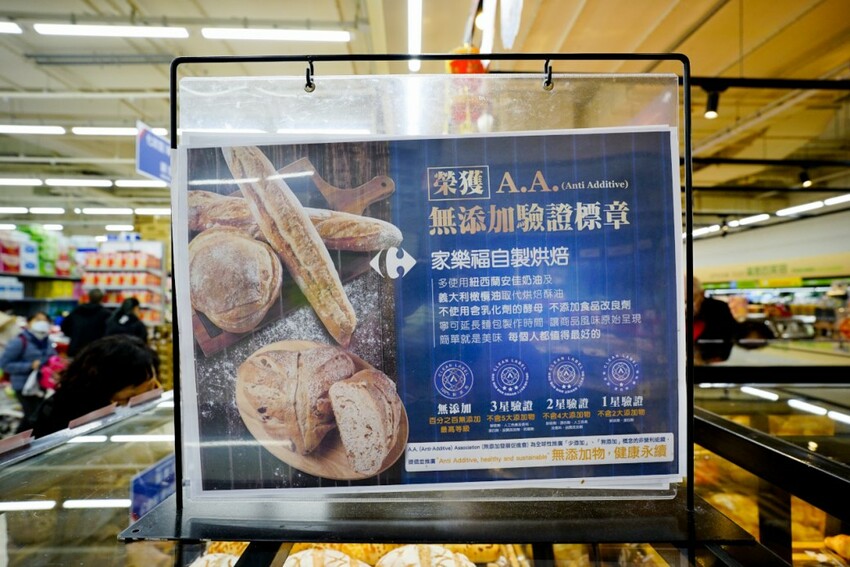 家樂福自製烘焙的麵包,可是有100%無添加驗證標章,