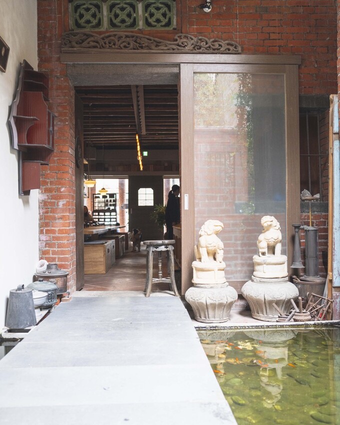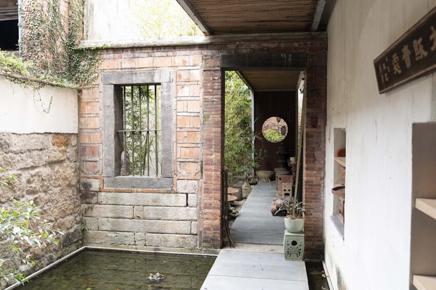 紅色磚牆老宅裡頭,水池裡的魚悠遊自在的游