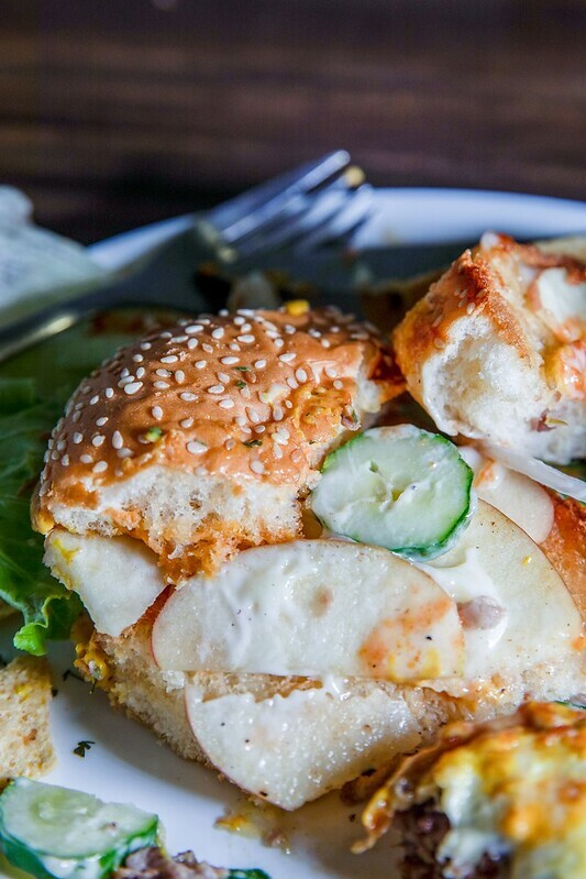 除了紅酒牛肉漢堡外,麵包很澎鬆、裡面的蔬菜非常多,還有蘋果片,所以雖然醬擠得滿滿,但整體吃起來算是蠻清爽的。