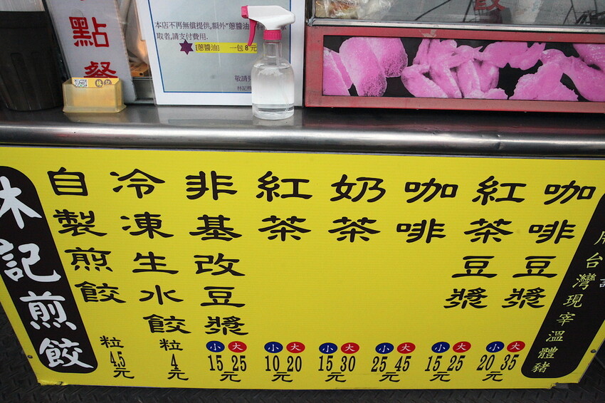 這攤位前面有掛上菜單供客人點餐參考,菜色有煎餃、冷凍煎餃、豆漿、紅茶、奶茶、咖啡...等等。