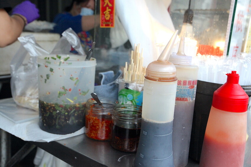 檯面上擺放各種醬汁供選擇添加來提味。