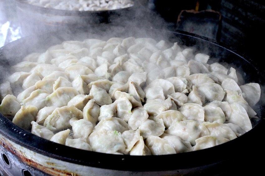 這油鍋鋪滿白白胖胖的餃子非常討喜。