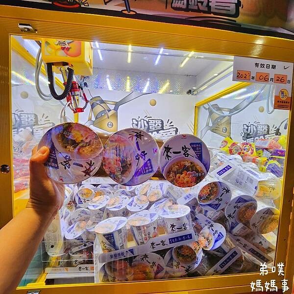 現場機台秒數超過10秒(印象中是14秒),老爺說這秒數長有誠意,人員勤快補貨認真,夾力都調的剛剛好,很值得每台機台都夾夾看。不過場內空間有限又人多,尤其是鐵罐、泡麵區,越裡面越多人,帶小孩推嬰兒車會比較辛苦。