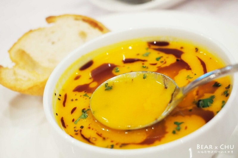 阿瑪迪斯咖啡館主廚濃湯也是搭配的,我們喝到的是胡蘿蔔濃湯,飽滿橘色濃湯的視覺實在美,喝起來不說還以為是南瓜濃湯,只是香氣比較清爽些,且甜度一點也不輸南瓜,用旁邊附的法國麵包片沾來吃也很讚。