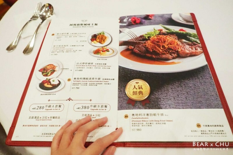Kaffee Amadeus阿瑪迪斯咖啡館菜單,有甜點下午茶、排餐、輕食等,這次我們吃的是主廚精選套餐,除了主餐之還有沙拉、湯品、麵包、甜點或冰淇淋,