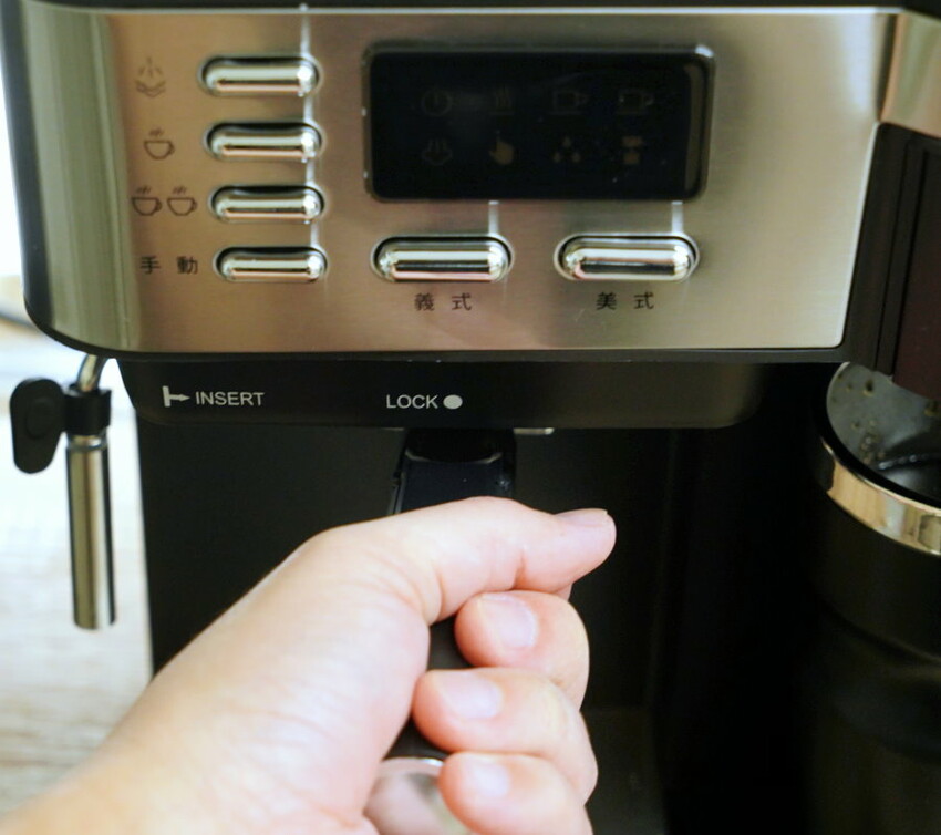 ▼接著將濾杯連同手把一起裝回咖啡機,從左到右鎖定即可!