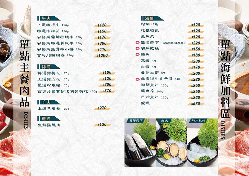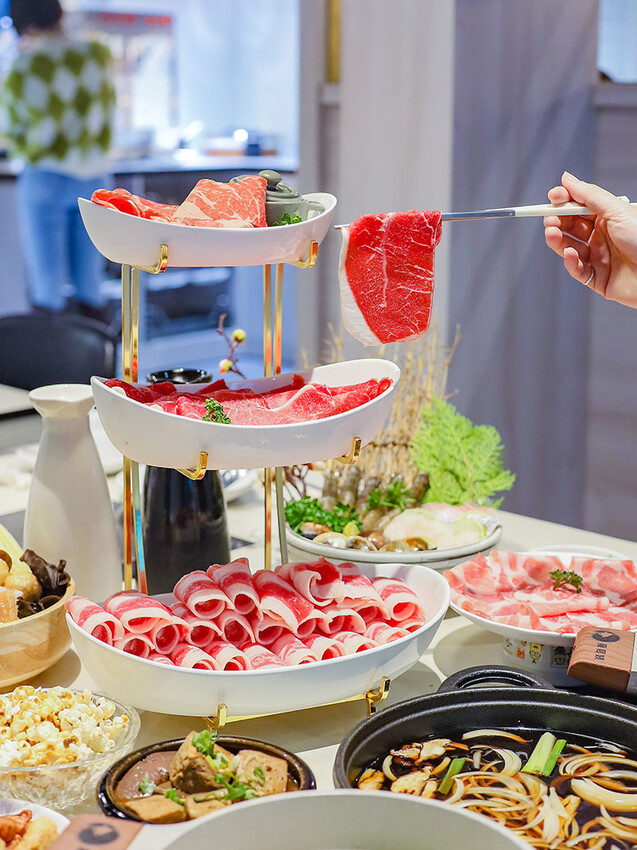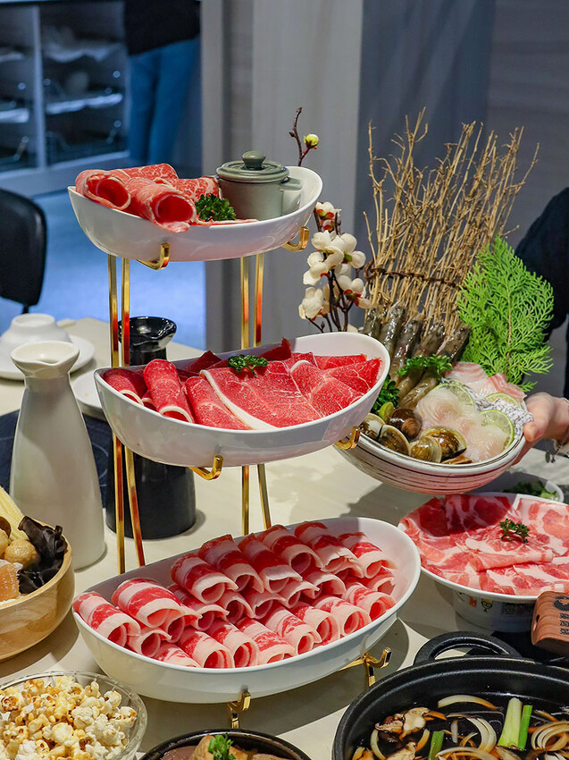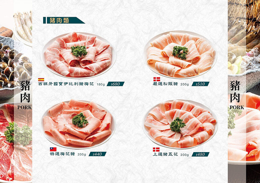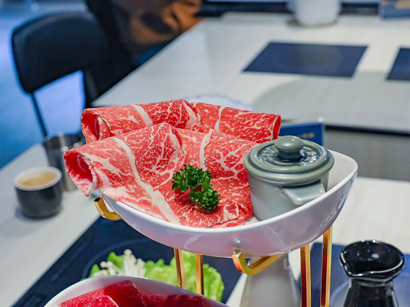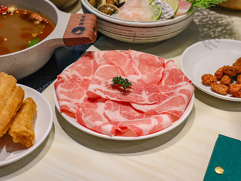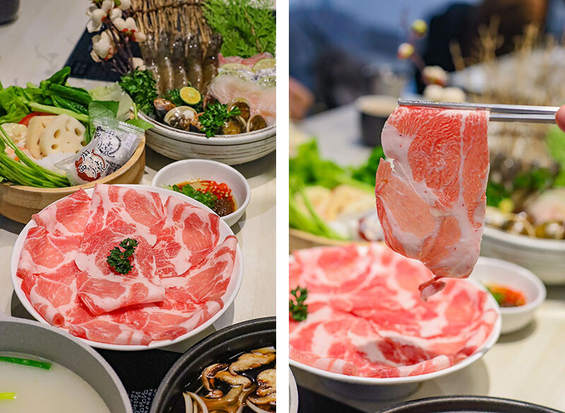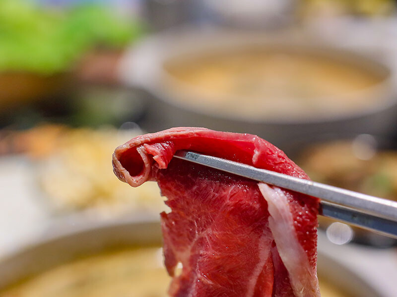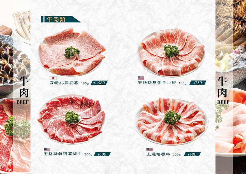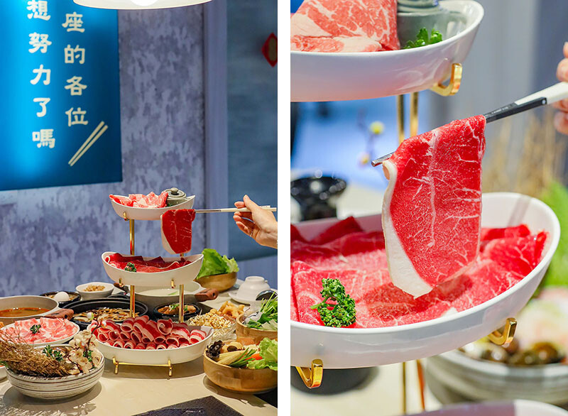 中間鮮紅肉面是板腱牛,中間的肉筋是口感的一大特色,品嘗起來牛味豐富,軟嫩中帶有嚼勁,推薦只要涮到3 ~ 5分就可以入口,柔嫩口感更甚。