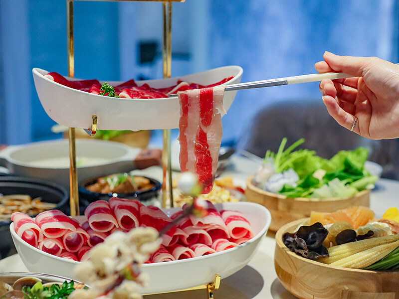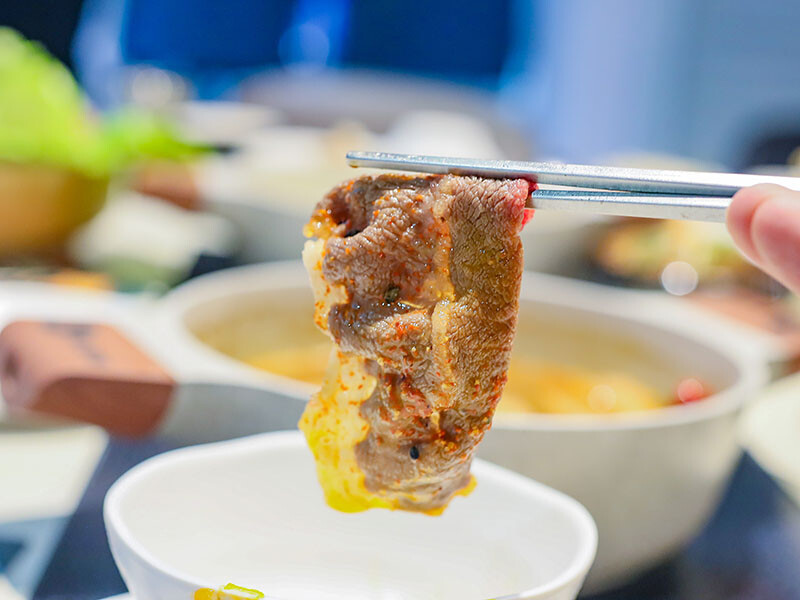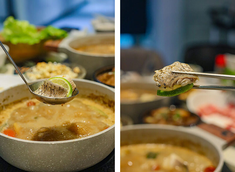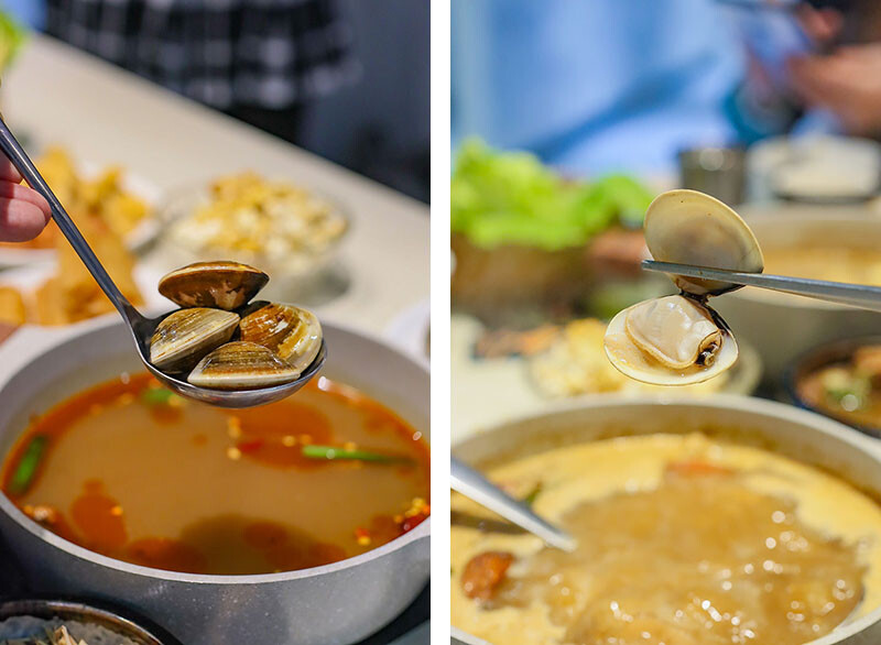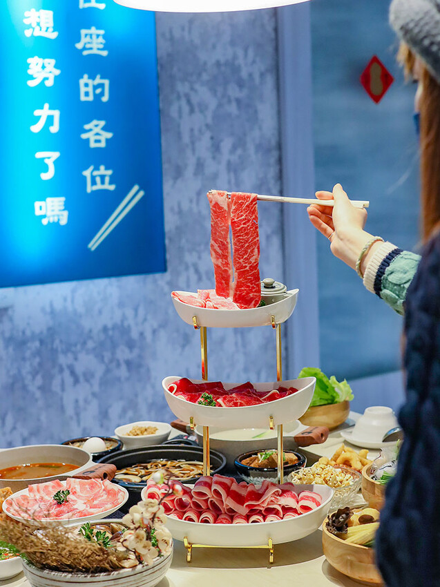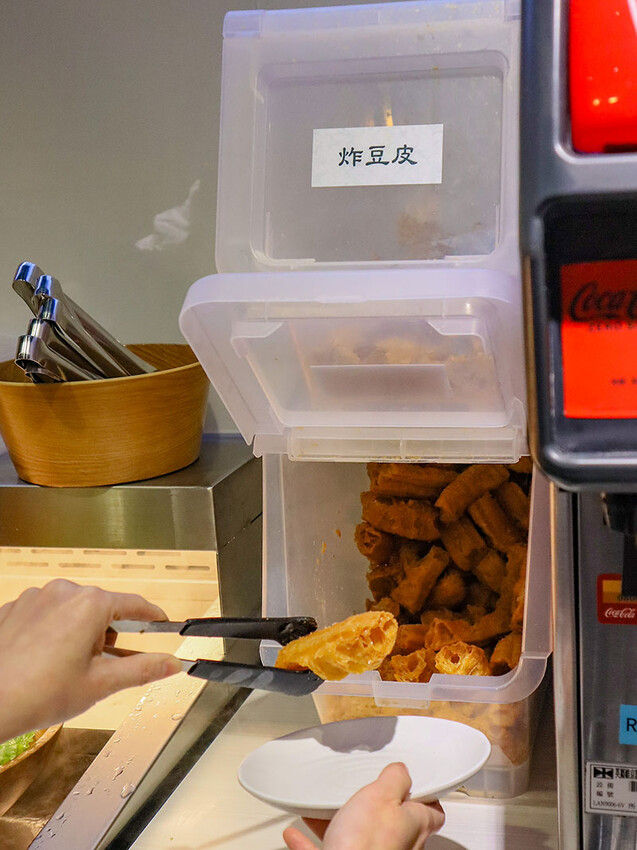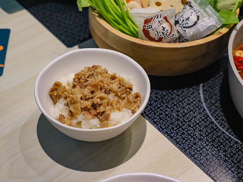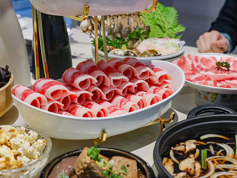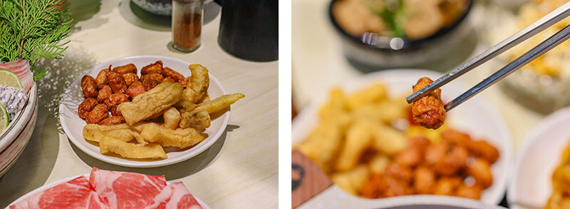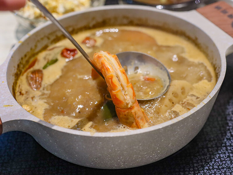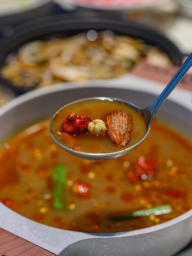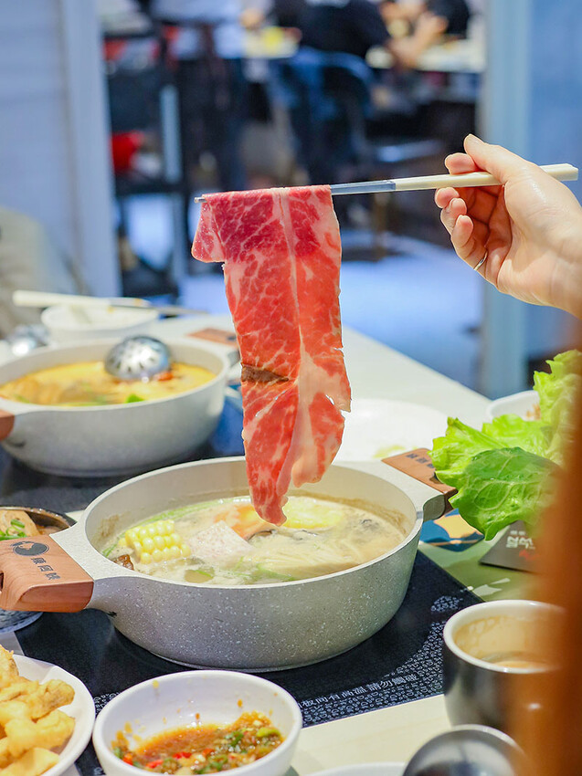選麻辣鍋(+$79)是看到自助區有絕佳搭配的老油條,多種中藥材搭配紅袍、白果、花椒呈現出麻香滋味,一上桌就是濃郁花椒麻香,剛入口是覺得有些辣,但隨著涮肉過後辣感降低多了甜味,會很想再喝一碗~