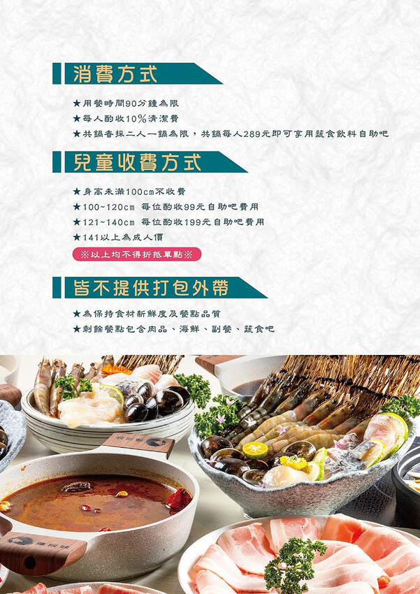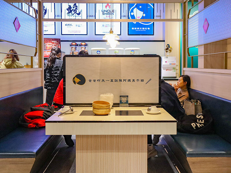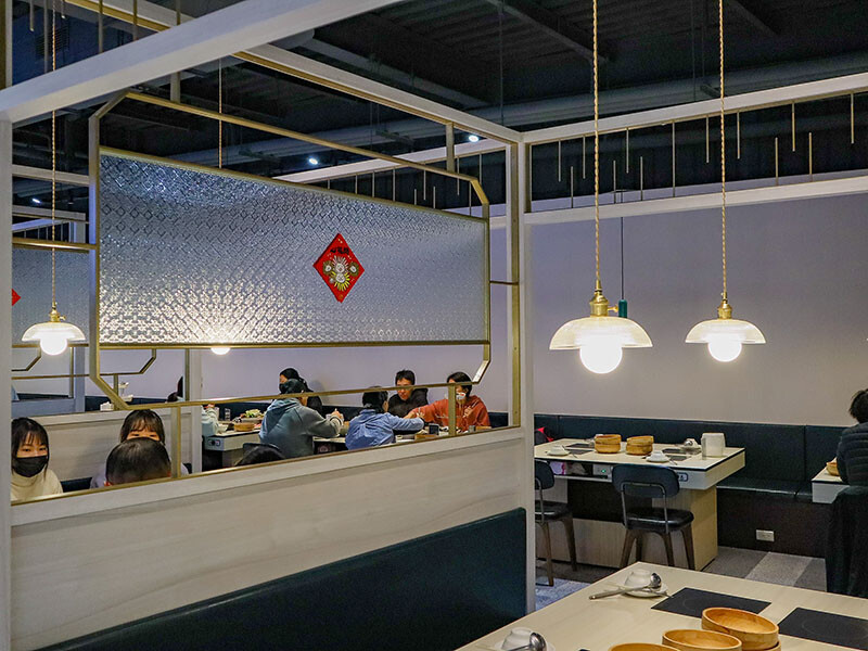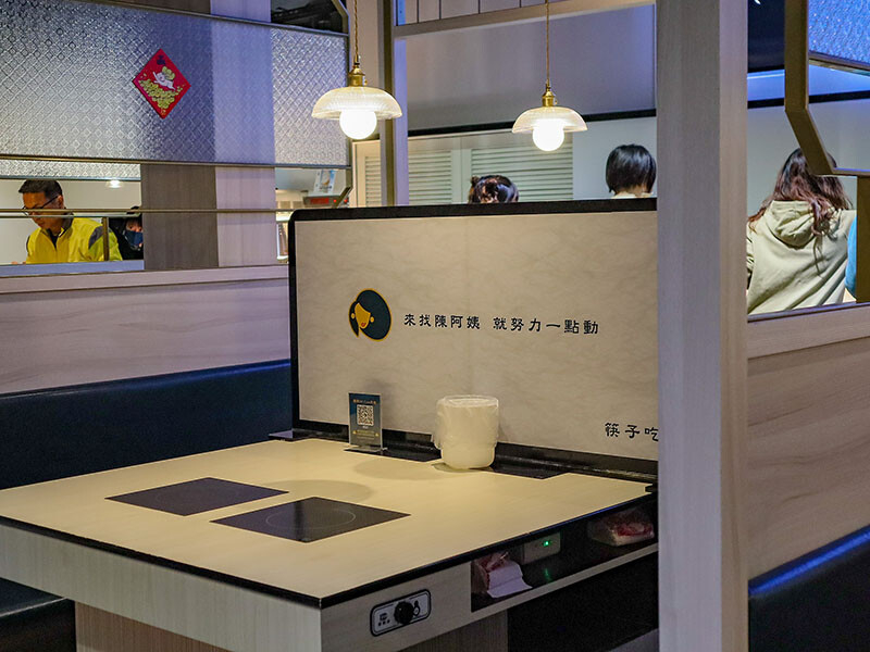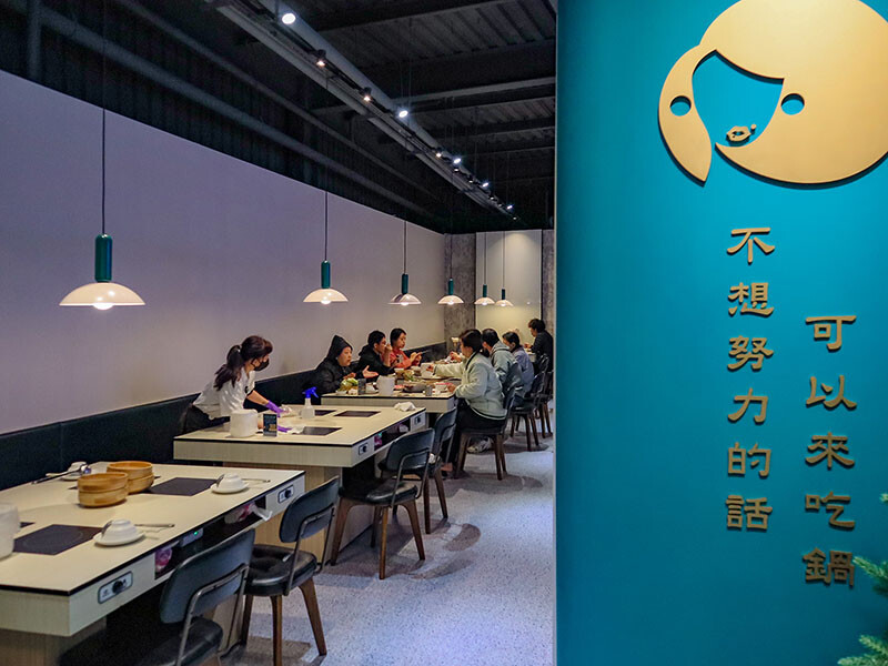 陳阿姨火鍋灶咖以留白為主調加以青墨綠點綴設計,營造出高貴雅致的用餐氛圍;吃到飽的自助吧靠邊,中間以壓花玻璃帶以金邊勾勒出有趣的遐想卻也不影響鄰座用餐的穿透空間,寬敞明亮,這樣的座位區可以滿足八人,若四人雙臨用餐,中間還有梗文標語的隔板,我都想要預約在隔板旁的座位了。