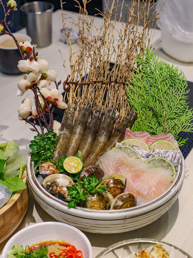 小海鮮由蛤蜊、白蝦、鱸魚、鯛魚、巴沙魚組成,蛤蜊夠大夠新鮮在口中噴發吃著超水嫩,魚肉有三種肉品搭配,各都有附上檸片搭配,鱸魚建議單獨享用,嘗有豐富的膠質魚肉感,鯛魚、巴沙魚可以墊著檸片吃,微甘微酸讓口感層次更豐富。