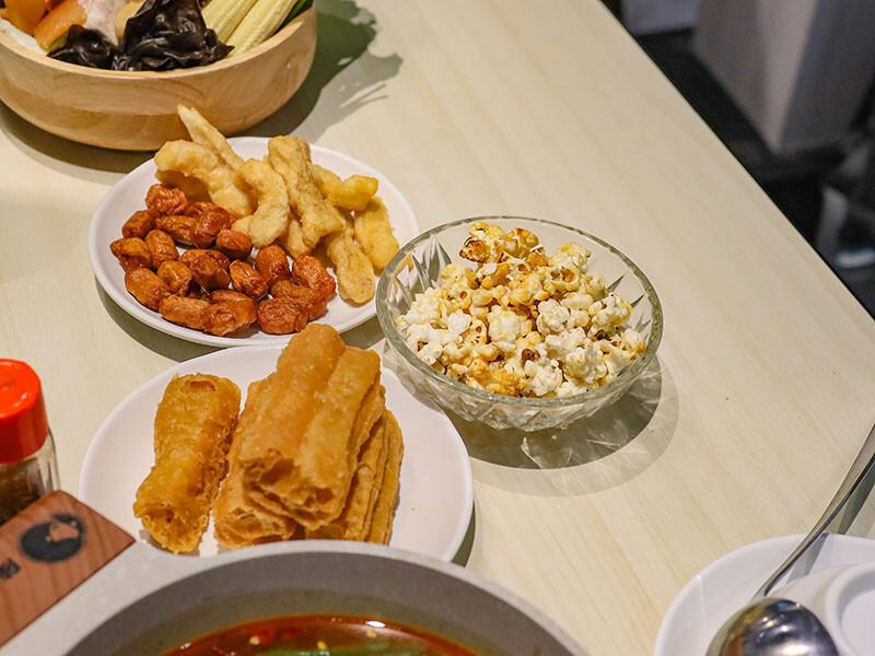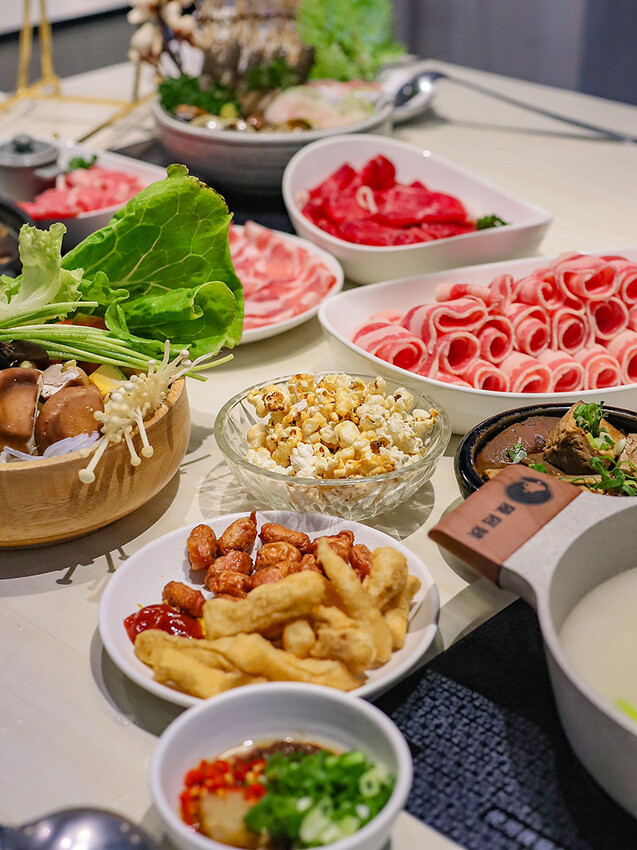 終於來到自助把吧,白皙的吧台真的太美。菜盤和火鍋料可以自己挑喜愛的選,板豆腐、刻花魷魚、米血、蓮藕、玉米筍等想吃甚麼自己夾,鍋料還有花生麻糬、魚餃 、尋味棒,都是受大家喜愛的特選項目。