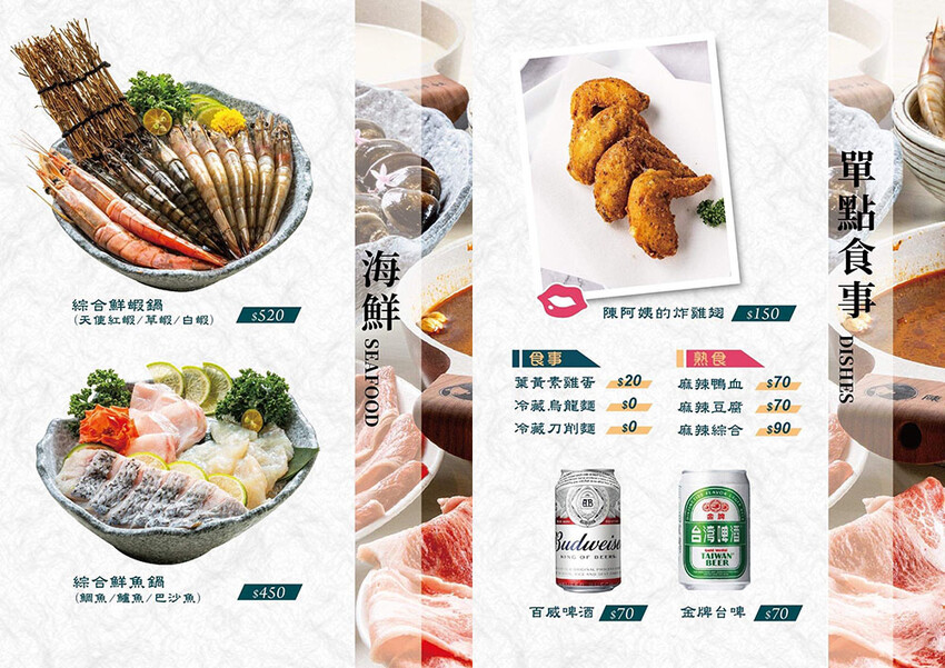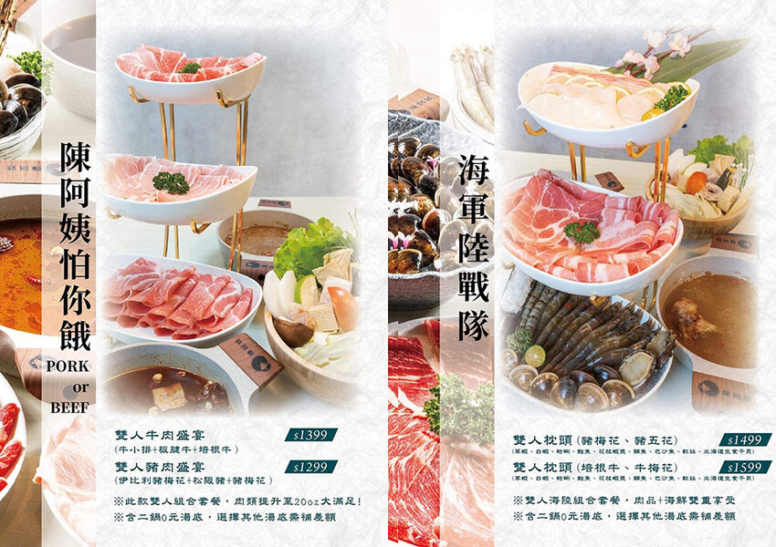 來到陳阿姨點餐不複雜,兩人同行就點雙人鍋,有陳阿姨怕你餓的雙人肉品盛宴,純肉大份量!想吃海鮮也有海軍陸戰隊的雙人枕頭(牛/豬+海鮮),各種肉品套餐、牛肉、羊肉、豬肉、海鮮雙拼通通有,麻辣鴨血、豆腐和陳阿姨炸雞翅也很不錯,想吃通通點起來~