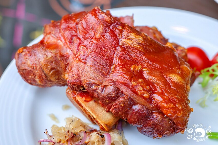 在餐廳才能吃到的德國烤豬腳,豬腳皮金黃酥脆,色澤迷人,大口咬下超級脆!豬腳肉嫩口Q彈,超超超好吃!想變化口味就搭配店家自製蜂蜜芥末醬,一旁還有烤櫛瓜、香菇等時蔬清爽解膩。