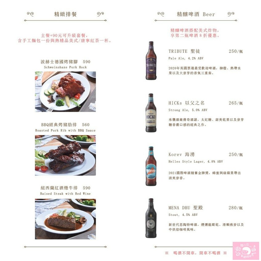 比較讓我驚訝的是菜單提供好幾樣排餐推薦,也有早午餐、甜點、炸物、沙拉、披薩、脆餅、鹹派、鬆餅、手沖咖啡、英國皇室茶等超多選擇,早餐、午餐和晚餐都包了!