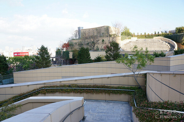 沿著建築物的造型設計的屋頂花園,可以沿著樓層拾級而上,共有8層的屋頂花園