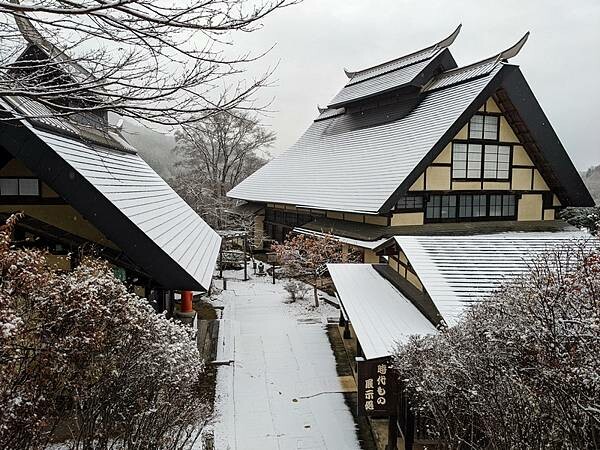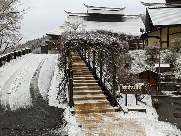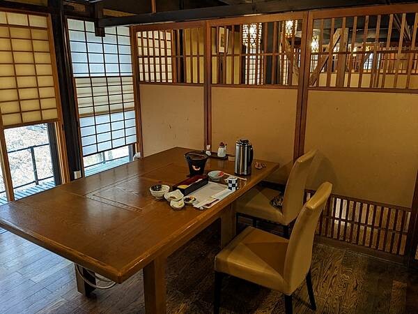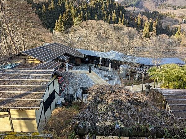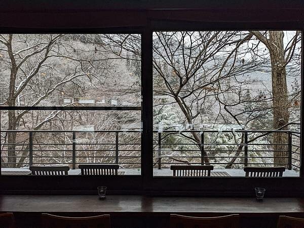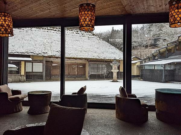 退房後在大廳悠閒喝杯咖啡,此時戶外溫度回升,小雪已變成小雨,初雪過後也結束在藥師溫泉旅籠很棒的住宿體驗,山中小村獨立隱世感受日本原風景。