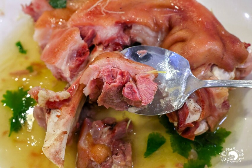外觀肥嫩帶Q的超大豬腳,以香料醃製加上長時間慢火燉煮,切開後看到豬腳肉色澤粉嫩、肉帶彈性 ﹐皮Q彈牙又入味,一口咬下充滿膠質卻不會油膩。