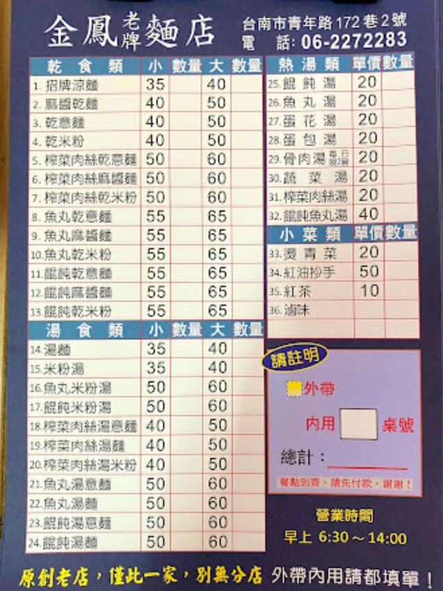 台南東菜市場的歷史已有百年之久,這家金鳳老牌麵店則是開店已有六十多年的老店了,很多上市場買菜的家庭主婦婆婆媽媽們都會來此用餐,能夠得到婆婆媽媽的肯定,手藝自然不在話下,難怪能屹立多年