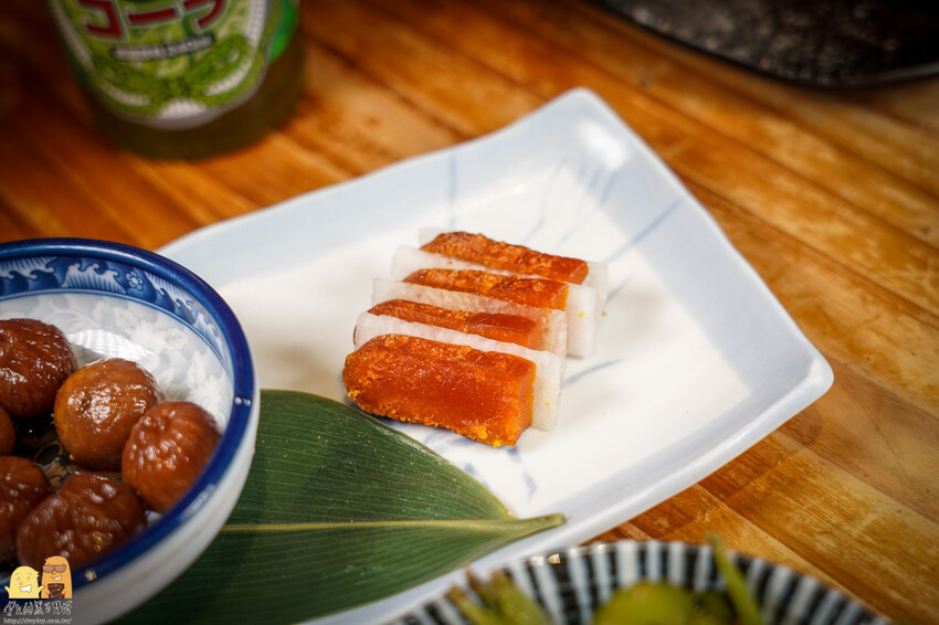烤過的烏魚子先不說,搭配清爽的白蘿蔔片也太絕配,白蘿蔔片清脆的口感之外帶點水果一般的甜,就像開窗後吹入的清風,給你一股清爽的口感,然後烤烏魚子濃濃的魚卵的油脂味襲來,豐厚、確實的像老船長一樣將味覺的舵牢牢抓住,烤過的鮮味跟香氣,帶著一點點的炙烤,把整個鼻腔占滿!