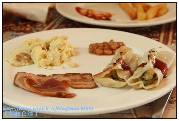 炒蛋、培根、一些些的焗豆,還有二個煎餃。