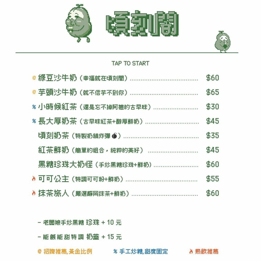 說到帶有古早味的經典飲品,絕對不能不提到的就是綠豆沙,這家位在士林的【頃刻間綠豆沙牛奶專賣店】,以新潮的復古電玩風格為特色,LOGO以綠豆公仔搭配電玩字樣呈現,來買飲料就像踏入電玩場景中,還可以免費爽玩電動遊戲,搭配每日新鮮手工現煮的食材,讓人不知不覺一喝就上癮。