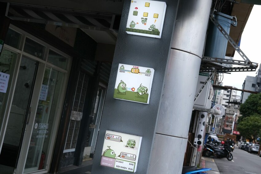 ▼【頃刻間綠豆沙牛奶專賣店】櫃台以掌上型電玩Game Boy為設計,牆面也是熟悉的電玩場景,主角變成了綠豆跟牛奶公仔,真的是創意十足。