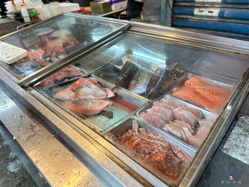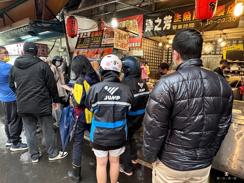 津之芳生魚片專賣店重慶店,位在板橋重慶路的黃昏市場裡,從重慶路這一頭進去走沒多久,看到排隊人潮就是了!