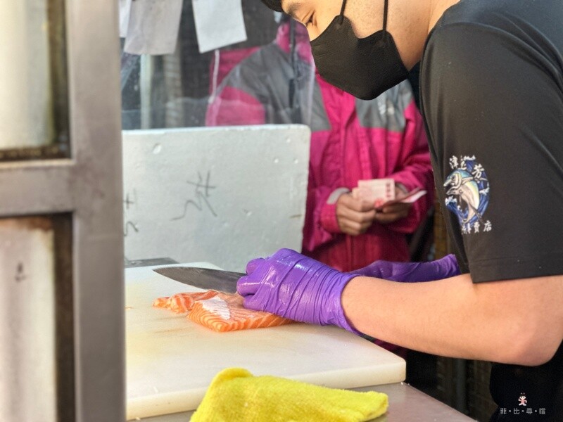 師傅全程戴著手套,切不同的生魚片,都會擦拭處理臺,動作從容有自己的節奏
