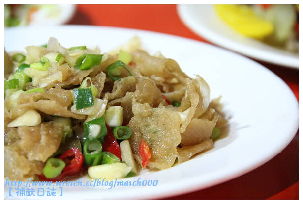 再來是【炒山豬頭皮】,這是用蒜、小辣椒爆香,再撒上蔥花!