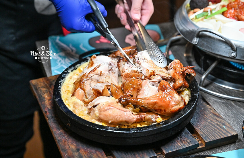 一整隻的烤雞,外皮金黃焦香,底部鋪滿鍋巴飯與牽絲起司,熱騰騰上桌時,香氣白煙伴隨著起司在鑄鐵鍋上噗滋噗滋冒著泡,非常誘人口水