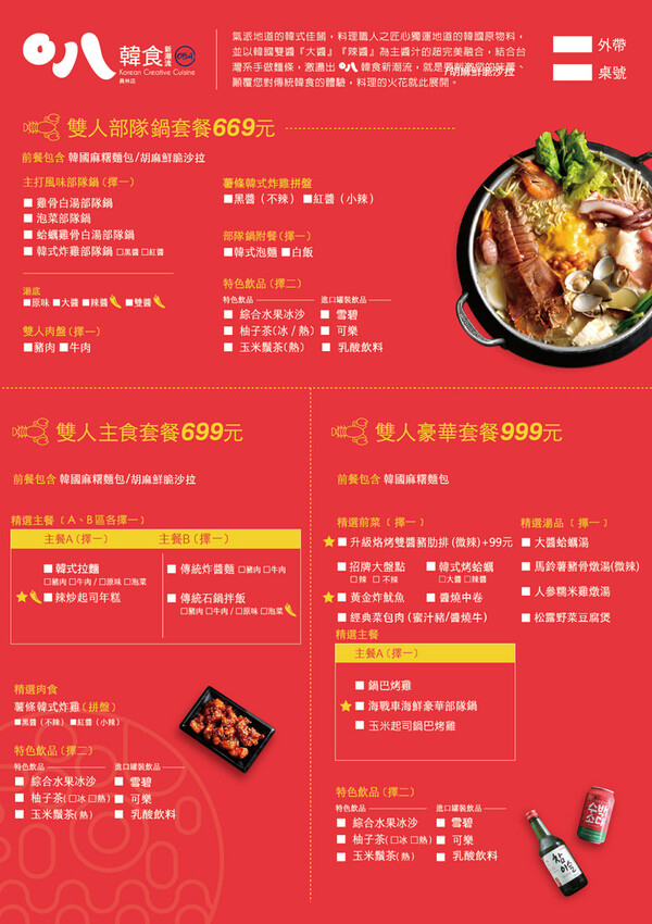 雙人套餐有3種價位可以挑選,人多來用餐的話可以像我們4個人直接選雙人豪華套餐,然後再單點些喜歡的韓式料理。
