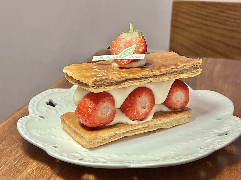 搭配超酥脆的千層派,卡滋卡滋的酥脆感,讓我一口接一起來,裡頭卡士達奶油加入新鮮香草莢,這個一公斤可是要好幾萬的頂級香料~