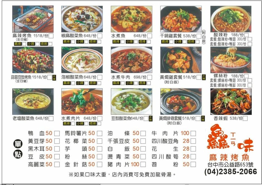想吃烤魚不用再苦苦等候排隊。,來自員林的人氣【鱻味麻辣烤魚】來台中了,承襲正宗道地的重慶辣香風味,無論是麻辣烤魚、酸菜魚還是螺獅粉通通有,霸氣選用整尾的海水金目鱸魚,搭配重慶進口的醬料及祕方,打造出最原汁原味的香辣風味,飽受在地老饕的喜愛及推崇 !