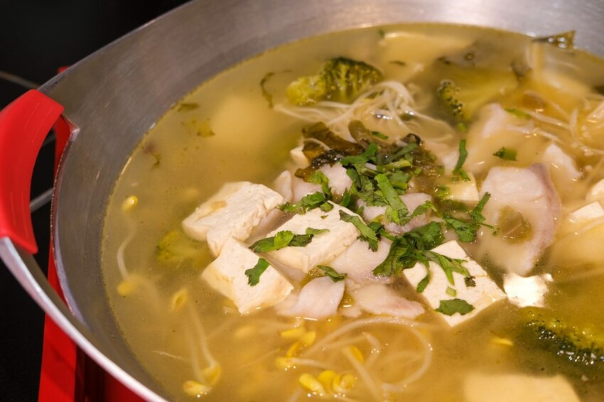 ▼端上桌就散發香氣的老壇酸菜魚,使用重慶香料及道地的老壇酸菜熬煮,酸香中帶點胡椒的辣味,湯頭溫醇讓人越喝越上癮,整鍋料好滿滿。