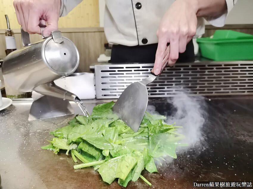 在點餐前會詢問青菜的辣度,我選擇小辣就好,有別於鐵板燒常見的豆芽菜,這裡則是用高麗菜以及菠菜,熱呼呼青菜搭配白飯,馬上讓人胃口大開啊