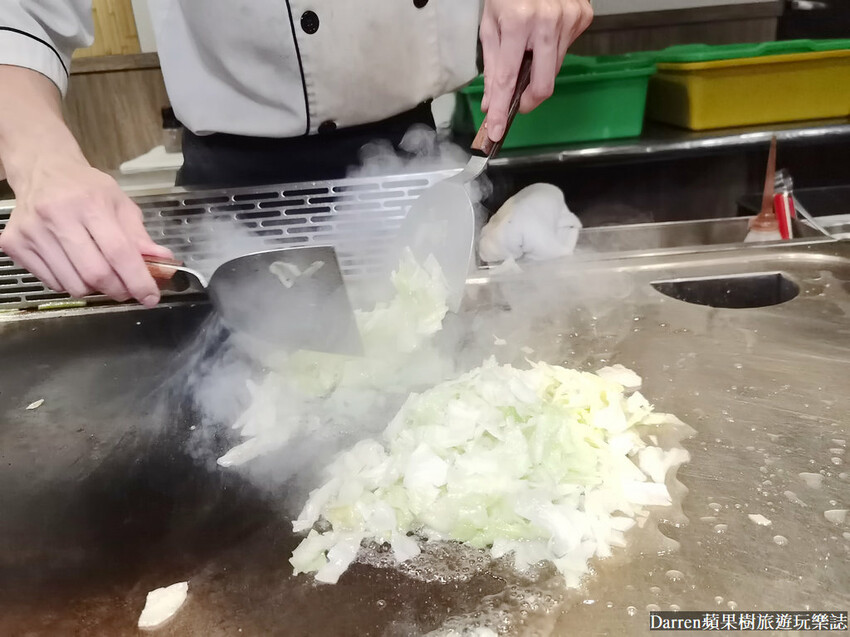 確認完餐點之後,鐵板燒師傅就會開始先在鐵板炒季節時蔬,看著師傅把處理好的蔬菜,大把大把往鐵板放,份量給的還不少呢