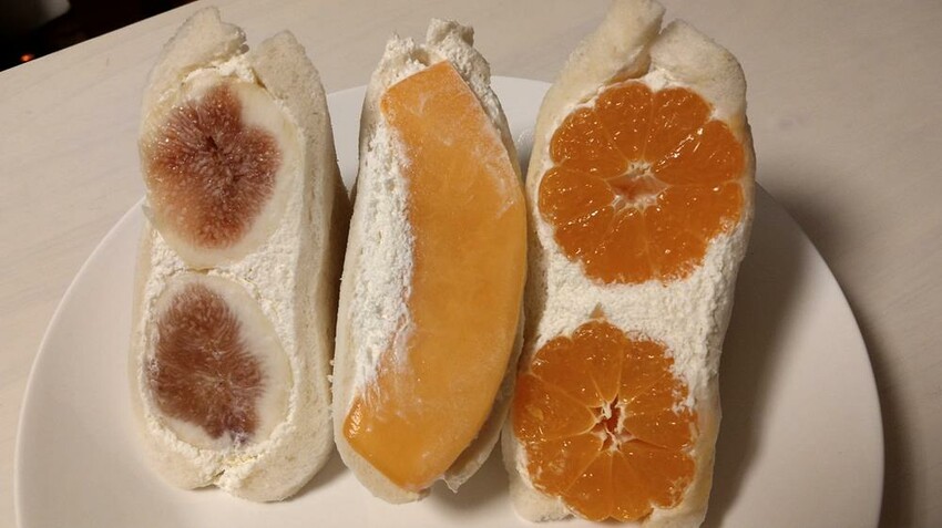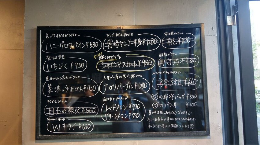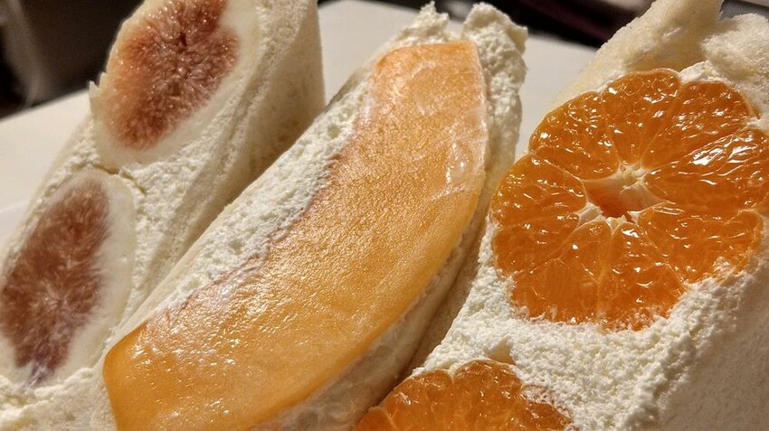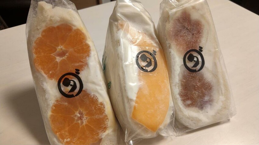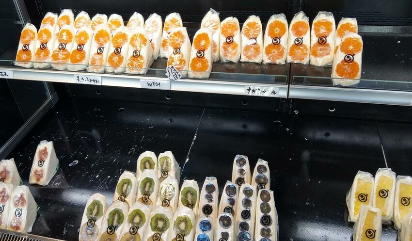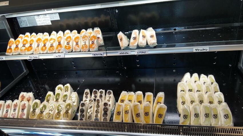 三明治的口味隨季節而不同,但仍有定番的將近十種長年販售。季節性的推薦水果則會寫在一旁的小黑板上,例如麝香葡萄或水蜜桃等等。所以別忘了看看小黑板有沒有甚麼當季的限定商品喔~