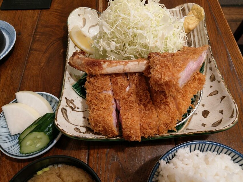 店內的名物是帶骨頭的厚切豬排,拿著刀叉切著吃有種在吃戰斧豬排的快感。適度的脂肪肥而不膩,搭配上厚切的肉汁,讓人十分滿足的一品。