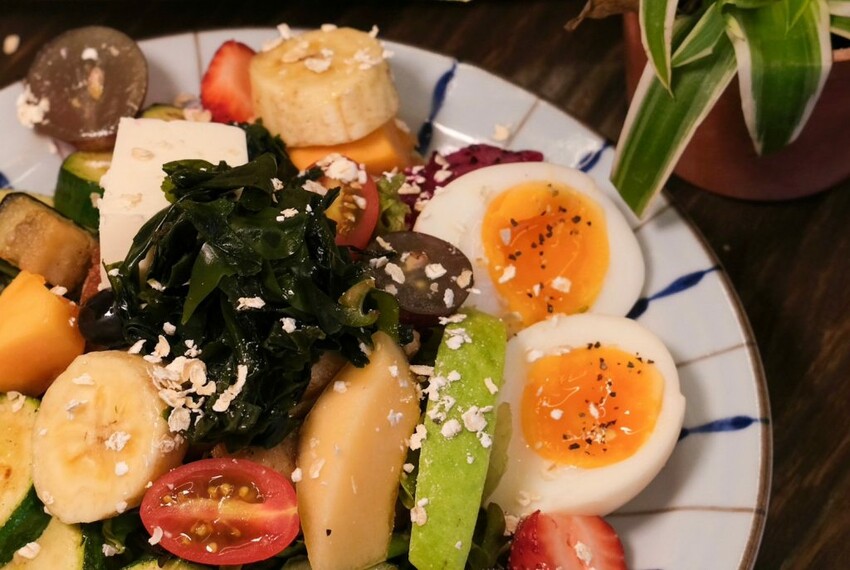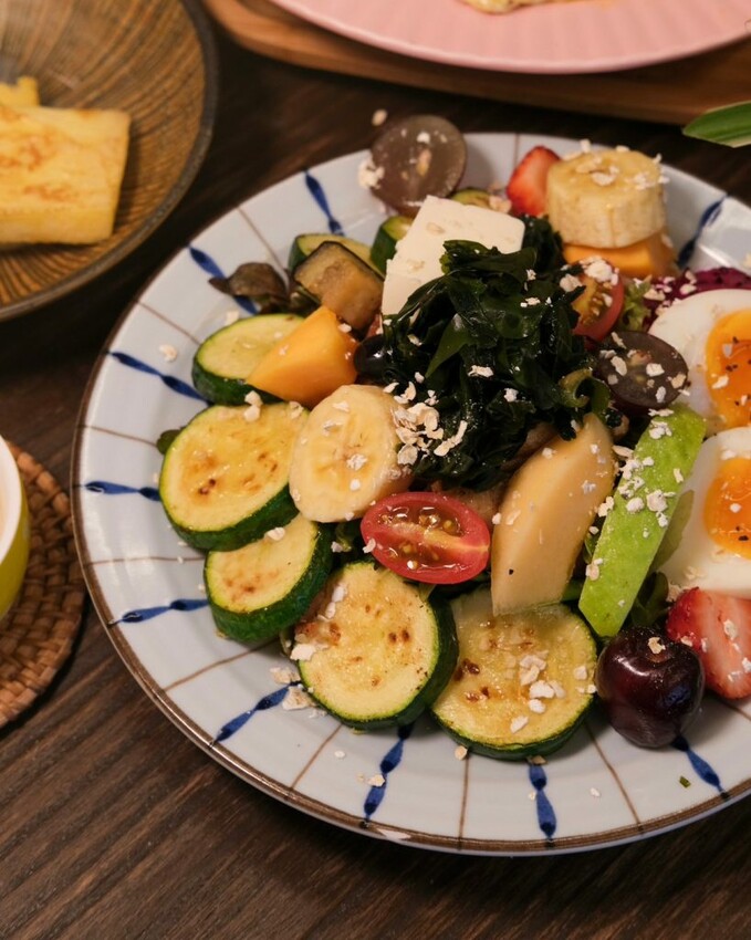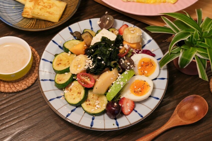 ▼賣相繽紛的櫛瓜嫩煎雞腿輕沙拉,光用看的就覺得充滿營養,包含新鮮綜合生菜、溏心蛋、草莓、火龍果、木瓜、哈密瓜、香煎雞腿及櫛瓜等,水果很值得稱讚,每一個都很新鮮又甜,一次能夠吃到十多款嚴選食材,煎過的雞腿肉口感紮實軟嫩,搭配清爽不油膩的手工胡麻醬相當對味。