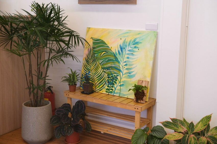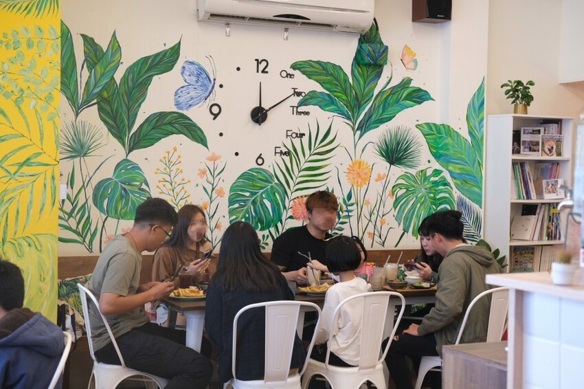 ▼延續【阿飛Brunch】店門充滿森林系的設計,店內牆面以老闆娘創作的植物塗鴉,搭配良好的採光視線,讓整個空間賦予了新的生命,讓人就像來到一座綠洲般美麗。