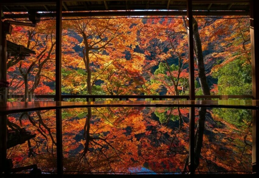 祐齋亭是嵐山最新的賞楓景點,有著媲美琉璃光院的風景及魅力,最吸引人的就是從室內望出去的圓形窗景及如夢似幻的鏡面倒影,更映襯著紅楓的美,讓人拍照拍得停不下來!祐齋亭還有染色工房、水鏡等有趣的體驗,只要從渡月橋處步行約10分鐘即可到達,是來到嵐山必訪的景點之一。