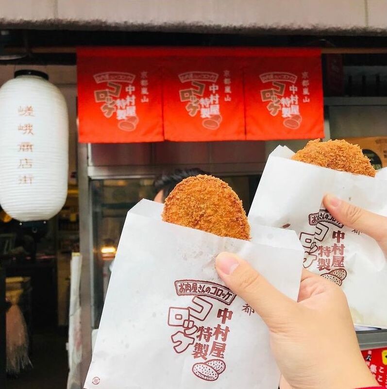 中村屋可樂餅是嵐山這帶的美食名物,它不在渡月橋一帶,而是位於從JR嵯峨嵐山站往渡月橋的路上。看似不起眼的小店,可是已開業60年,人潮總是絡繹不絕,除了觀光客必吃之外,更是深受日本當地人的喜愛。炸得酥脆的麵包粉外衣,內餡則是扎實的馬鈴薯及牛肉,吃的就是可樂餅那美味而樸實味道。