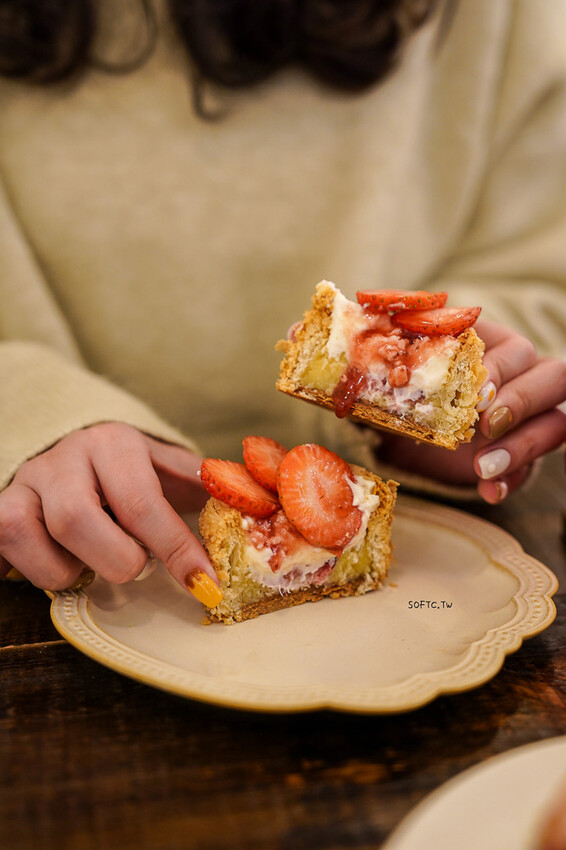 上面灑滿滿茶粉,雖然是紅茶口味但沒什麼茶味,甜度也偏低滿適合不嗜甜的朋朋,外皮微脆,軟西還是比較喜歡草莓甜點們XD。