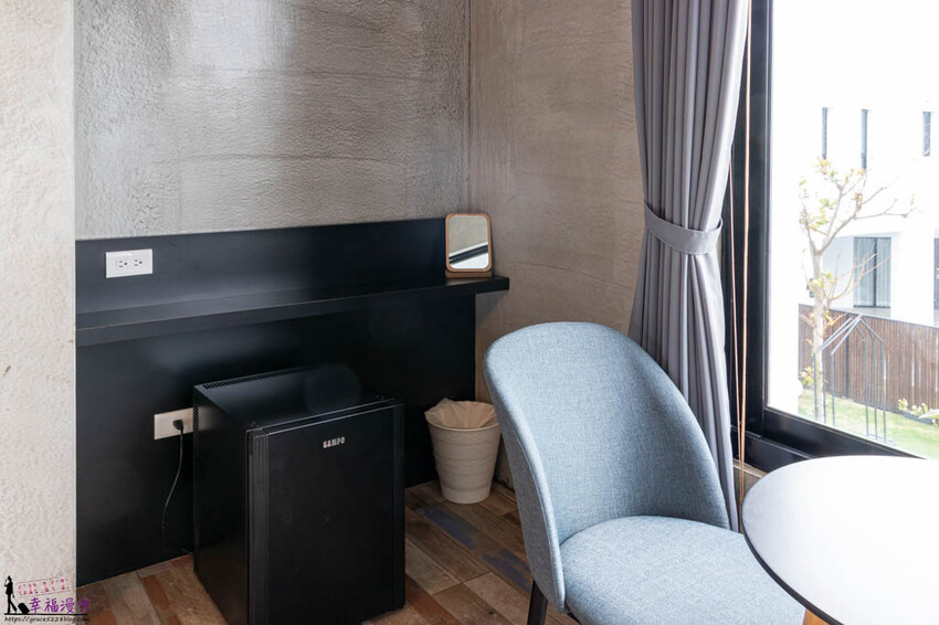 窗台邊有個小木台,這裡有著插座,方便住宿的旅客可以充些3C產品的電源,小冰箱也放置在此處。