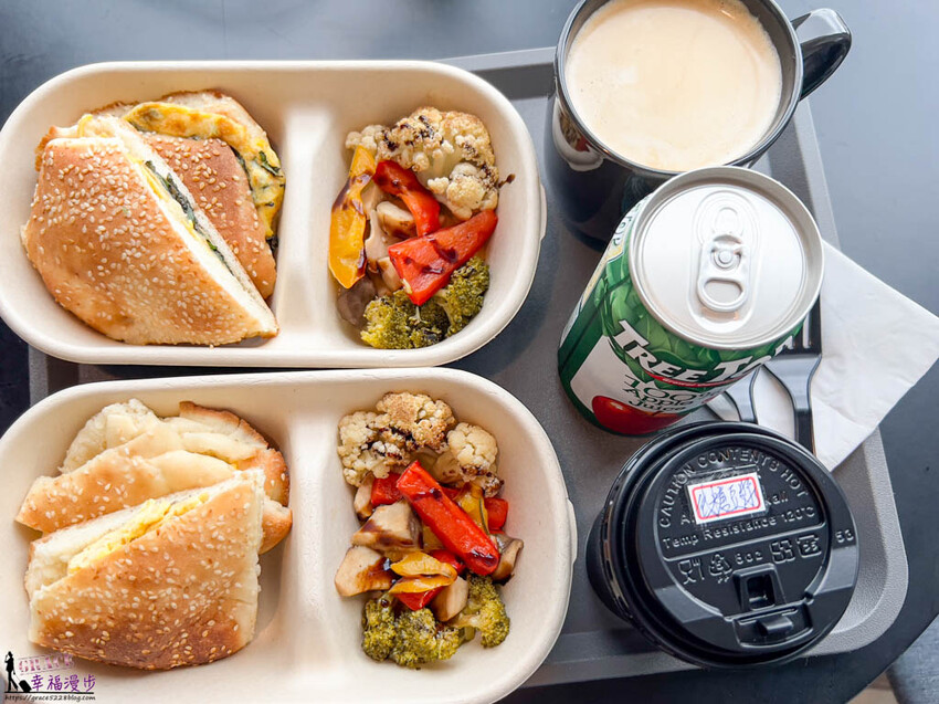 第二天早上的早餐是送到房間內食用,有著澎湖有名的燒餅夾蛋,我是搭配咖啡、無尾熊是喝無糖豆漿,民宿還給一罐蘋果汁,搭配著炙烤過的蔬菜,早餐就這樣吃也很飽足。