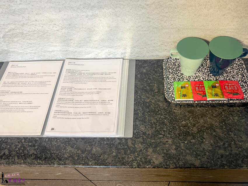 右側的櫃子上有著茶包和住宿須知,住宿須知裡面也有著民宿提供的周邊商品販售,喜歡都可以直接購買回家。