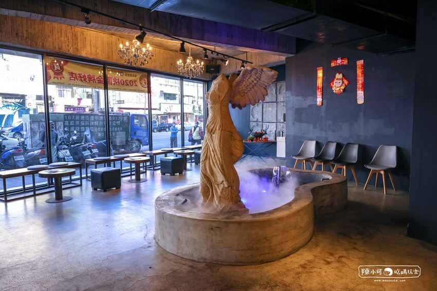顯眼的女神噴水池在候位區中央,乾冰製造出雲霧瀰漫的效果,氣派又夢幻。