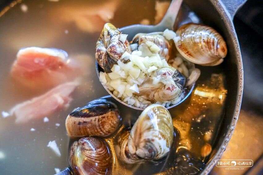 看到鑄鐵鍋裡滿滿滿的大顆蛤蠣、雞腿肉和蒜頭,超吸睛畫面吸引我們的目光,還沒煮就聞到好香的蒜味。