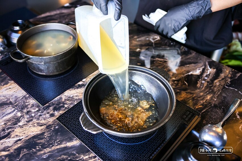 石頭鍋上桌,如果想現場爆香也可以跟店員說,以蔥蒜提味,炒料一定超香的!不想吃太油就直接加湯,湯頭鮮香醇厚,要是喜歡吃重蒜口味,還可以到自助區拿蒜末來加,味道升級。