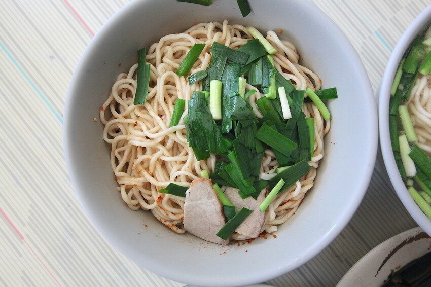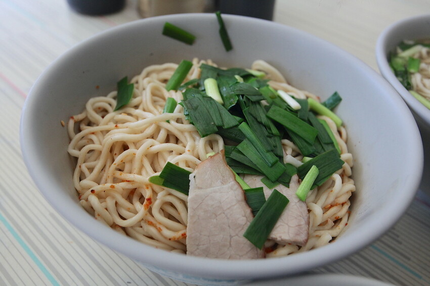 這乾意麵很大碗份量多定價50元很合理,表面鋪上韭菜及肉片來做配料,肉片肉質Q彈又軟嫩真好吃